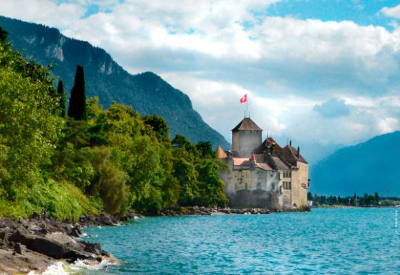 Das Schloss Chillon, unweit von Vevey und Montreux, auf schroffen Felsen am Ufer des Genfersee gelegen, stammt aus dem 12. Jahrhundert. Bereits während der Bronzezeit war der Felsen von Chillon bewohnt. Die heutige Gestalt des Schlosses Chillon wurde in langer Arbeit herausgebildet und beeindruckt mit einer geschichtsträchtigen Sorgfalt bis ins Detail.